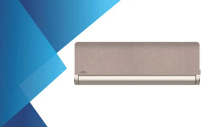 Fisher Art FSAIF-Art-94AE3-G-BR / FSOAIF-Art-94AE3 2,5 kW inverteres split klíma szett, arany színű készülékházzal és cserélhető aranybarna textil előlappal, R32 hűtőközeggel. Különleges megjelenésű, energiatakarékos klíma kisebb helyiségek hűtésére és fűtésére.