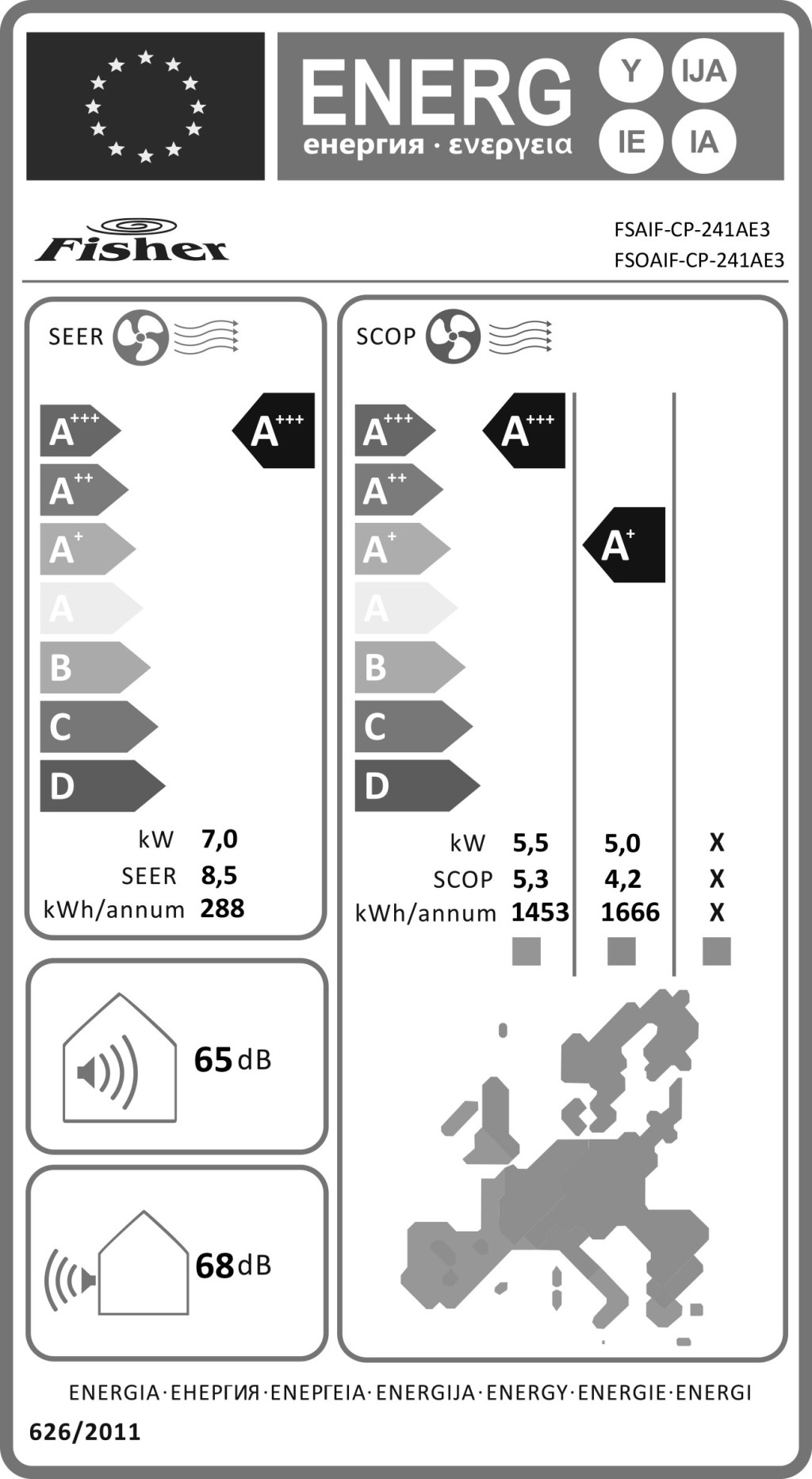 Infra távirányítóIgen, fali tartóvalVezetékes távirányító OpcióMemóriában eltárolható egyéni beállításWifi vezérlésen keresztül elérhetőDigitális kijelzés Igen"Gyerekzár" IgenKikapcsolható kijelzőpanel IgenSzobahőmérséklet kijelzés Igen"COLD PLAZMA" ionizátor Igen"Hideg-katalitikus" szűrő IgenPorszűrőIgen, növelt hatékonyságúMeleg indítás Igen"Follow me" funkció Igen8°C temperáló fűtés IgenÉjszakai üzemmód IgenPárátlanító üzemmód IgenTURBÓ üzemmód IgenAlacsony zajszintű üzemmód/ Csendesített üzemmód IgenIdőzítésIgen (24 óra idő intervallum) / WIFI vezérléssel heti programozhatóságNégyirányú automatikus légterelés (Swing) IgenAutomatikus átváltás (hűtés-fűtés között) IgenAutomatikus újraindulás áramkimaradás esetén IgenDC inverterIgen (3D DC)Karterfűtés a kompresszoron és tálcafűtés a kondenzáror alatt IgenECO üzemmód IgenFokozatmentesen állítható beltéri ventilátor IgenBillentyűzárIgenKönnyű szerelhetőség és karbantarthatóság IgenÖndiagnosztika-hibakijelzés IgenKorlátozható hőmérsékletbeállítási tartomány Opció"GOLDEN FIN" bevonatú hőcserélő Igen"BIO HEPA" finomszűrő IgenLégterelő memória funkció IgenKorlátozható teljesítményfelvétel (hűtési üzemben) IgenAktív tisztító funkció IgenHűtőköri hiba kijelzés Igen"Ne fújj rám" funkció IgenÜZEMI ÁRAMFELVÉTEL (A)Hűtés3.9Fűtés4.4Max. áramfelvétel (A)10.5TELJESÍTMÉNYFELVÉTELHűtésben (kW)0,925Fűtésben (kW)0,990MŰSZAKI ADATOKSorozatFisher COMFORT PLUS sorozatInverteres IgenHálózati áram (V/f/Hz) 230/1/50Javasolt biztosíték (A)C 16ANévleges fűtőteljesítmény a tervezési hőmérsékleten (-10°C) (kW)2.167Szükséges rásegítőfűtés a tervezési hőmérsékleten (-10°C) (kW)0.433Bivalens hőmérséklet (°C)-7Légszállítás (min./köz./max)530/380/290ÜZEMELTETÉSI HATÁROKKülső hőm. Hűtés (°C)-15 ~ 50Külső hőm. Fűtés (°C)-20 ~ 24Belső hőm. Hűtés (°C)16 - 32Belső hőm. Fűtés (°C)0 - 30ZAJSZINT (DB(A))max./köz/min.Beltéri hangnyomásszint dB(A) (min./köz./max.) v. (max.)21/34/41Beltéri hangteljesítményszint dB(A) (max.)55Kültéri hangteljesítményszint dB(A)59CSÖVEZÉSMax. össz. csőhossz (m)25Csőméret (mm)6.35/9.53Max. szintkülönbség (m)10MÉRETTömeg (beltéri/kültéri) (kg)10.2/26.4Beltéri (Szél.xMag.xMély.) (mm)855x300x235Kültéri (Szél.xMag.xMély.) (mm)765x555x303Talpméret (mm)452x286ÉVES ENERGIA FOGYASZTÁS ** (KWH/ÉV)Hűtés (kWh/év)144Fűtés (kWh/év)791Várható éves hűtési költség 5.407 FtVárható éves fűtési költség 29.702 FtTERVEZÉSI TERHELÉS (KW)Hűtés (kW)3.5Fűtés (kW)2.6